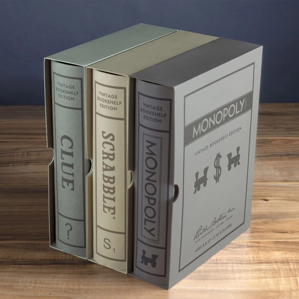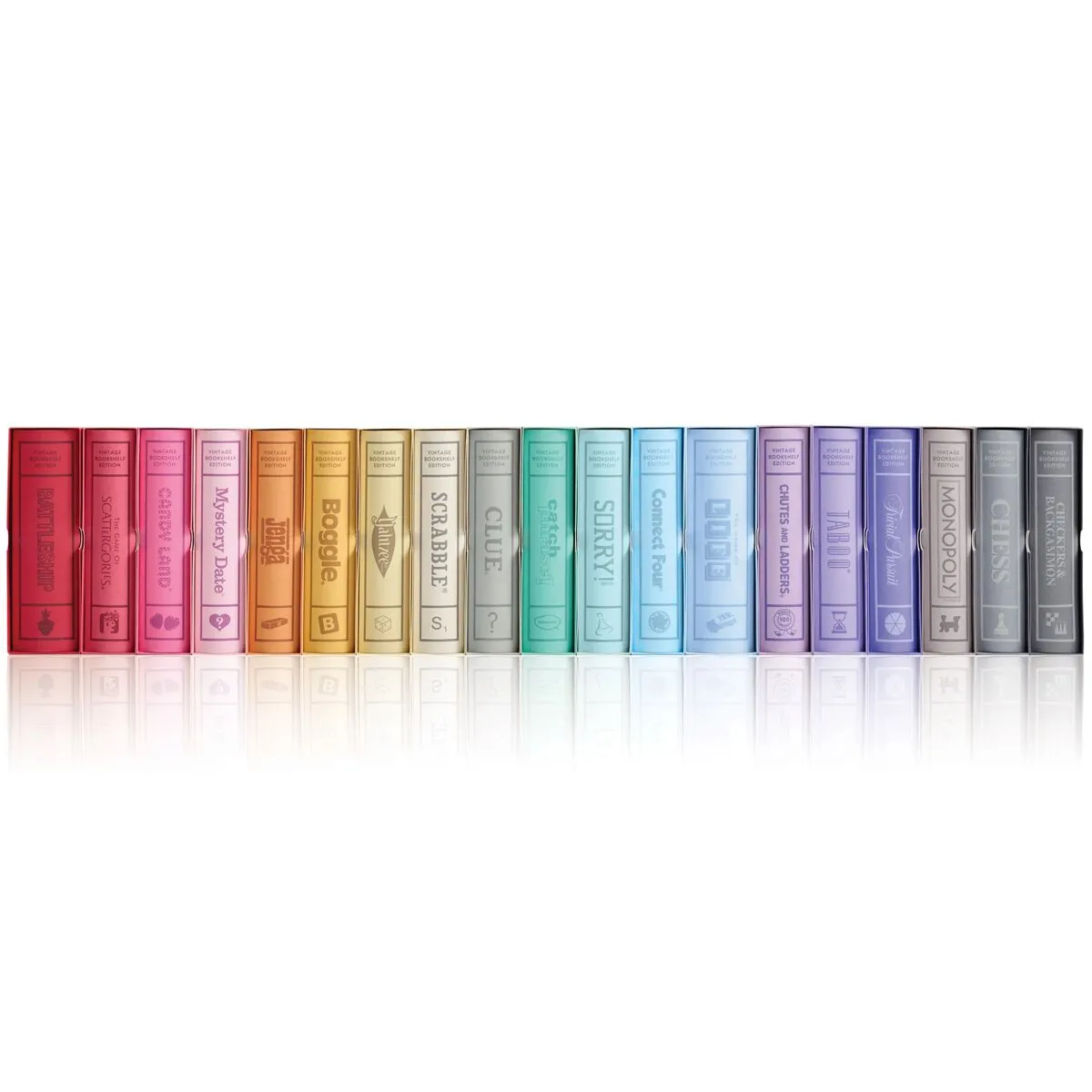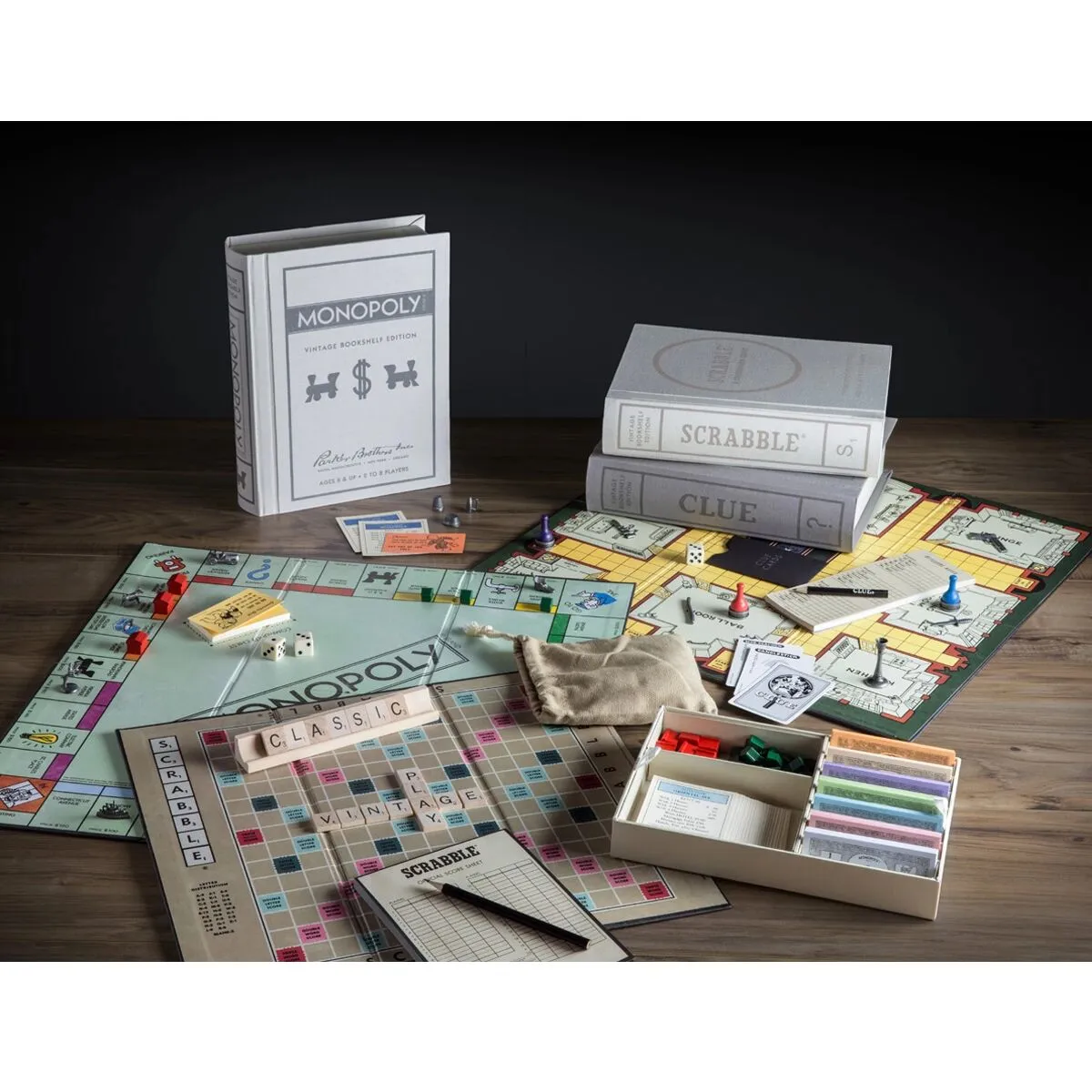 This Special Collection includes 19 Vintage Bookshelf Games. The designs of these Vintage Bookshelf Editions were inspired by the vintage graphics of classic editions of the game. The game designers have created an elegant storage method that allows you to store each game and all its components on your bookshelf among the classics.