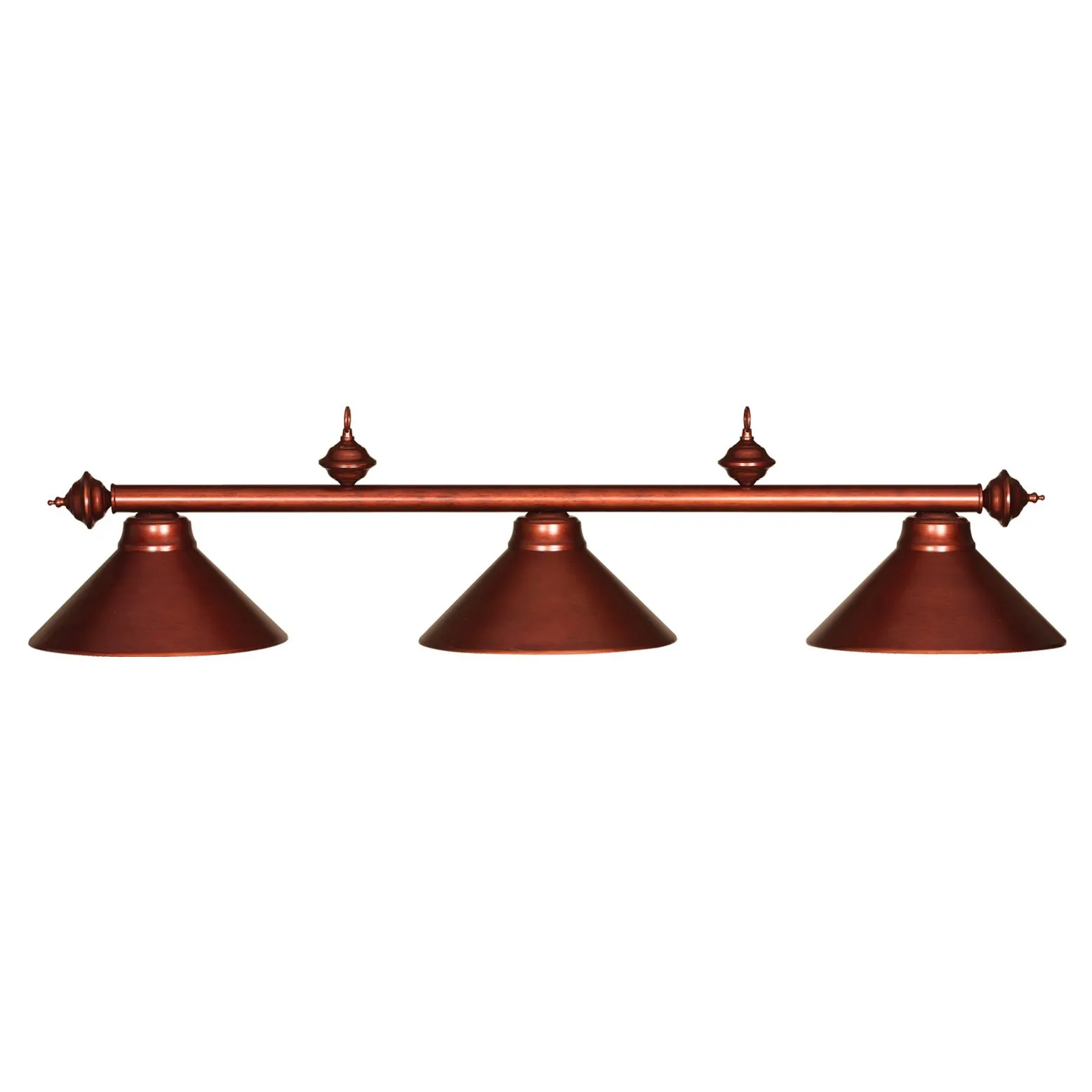 Classic and sophisticated, this 54 inch, 3-light metal billiards light fixture is exactly the upgrade your game room needs. Offering plentiful lighting for the home bar or for a pool table, this fixture features three metal cone shades to deliver directed illumination. Three foot chains on either side suspend this stylish fixture from the ceiling. The metal bar and shades feature matching finishes for a composed, elegant look.