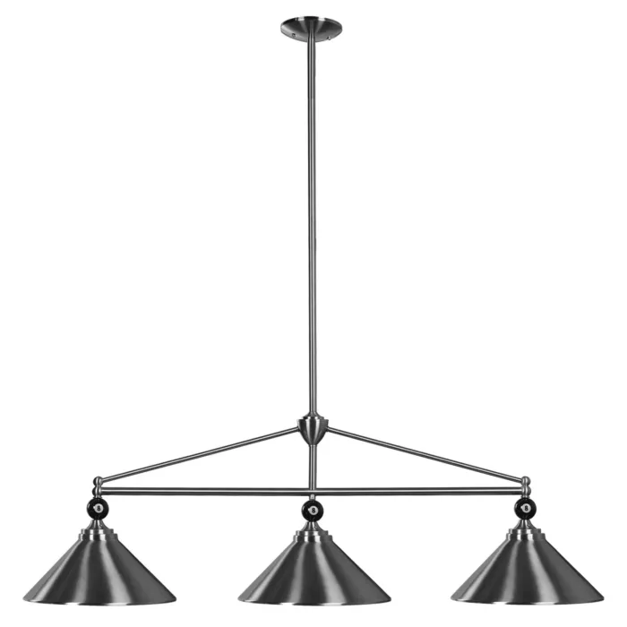 A small resin 8-ball embellishes each shade featured on this 3-light metal billiards light fixture. Delivering sleek, chic appeal over the pool table or bar, this long light fixture features a center post with a horizontal metal rod accented with triangular framing to draw the eye. Each lamp shade is made from slick stainless steel finish metal and presents a simple, classic cone shape. Measuring 54 inches in length, this light is a stylish upgrade for your game room.