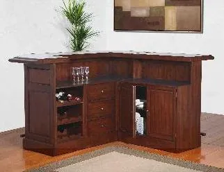 Bar includes a removable wine rack that can be placed on opposite side of return, laminate bar tending working surface, wood foot rest on front bar as well as return, 3 full extension drawers and 2 doors with adjustable shelf.