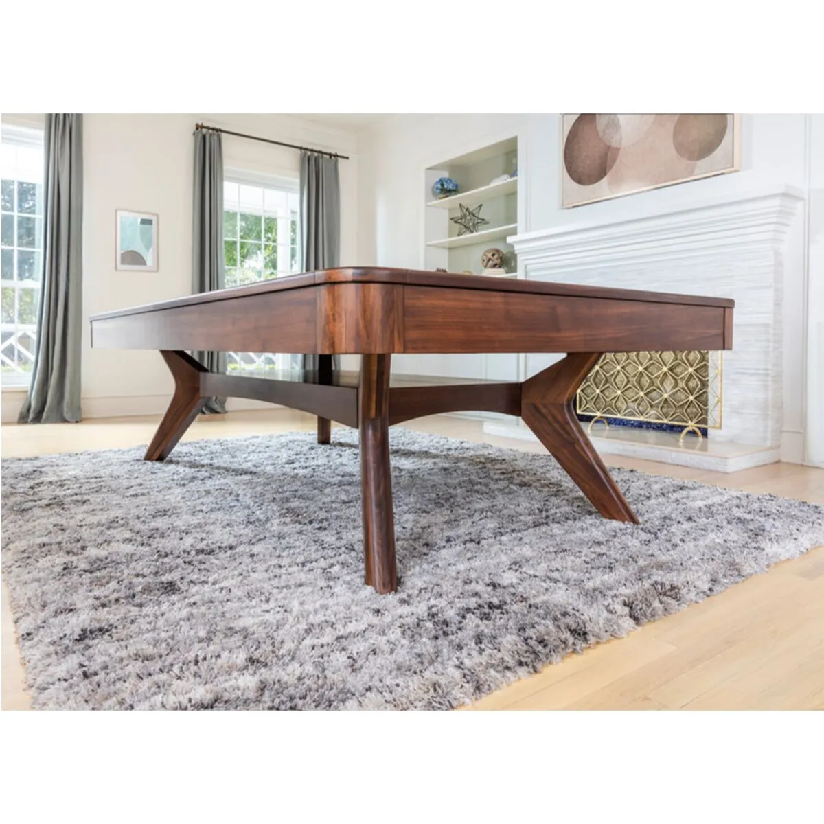 The Brevik Pool Table by Imperial blends timeless mid-century modern design with handcrafted luxury and tournament-grade performance. Featuring distinctive boomerang-style legs, rounded corners, and an integrated under-table accessory shelf, this table is as practical as it is beautiful. Built from solid walnut and accented with rich details, the Brevik is the centerpiece your game room deserves.