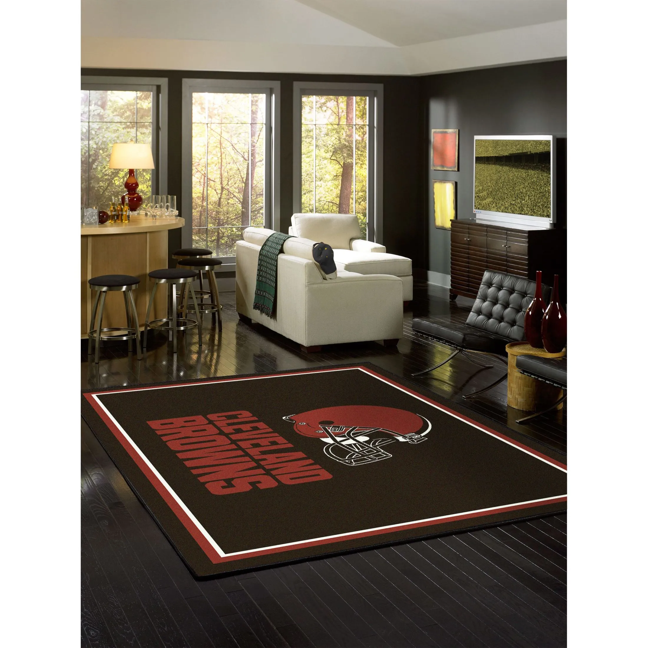 Show your team spirit with this officially licensed Cleveland Browns area rug, featuring team colors and a large team logo! Made with premium Stainmaster®nylon fiber, this rug is fade resistant, durable and easy to care for. Endura-Loc™ high performance backing helps assure the rug always lies flat and serged edges give your rug the quality that your home and team deserve. The rug has a 2 year warranty that protects against manufacturer’s defects. Product made in the USA.