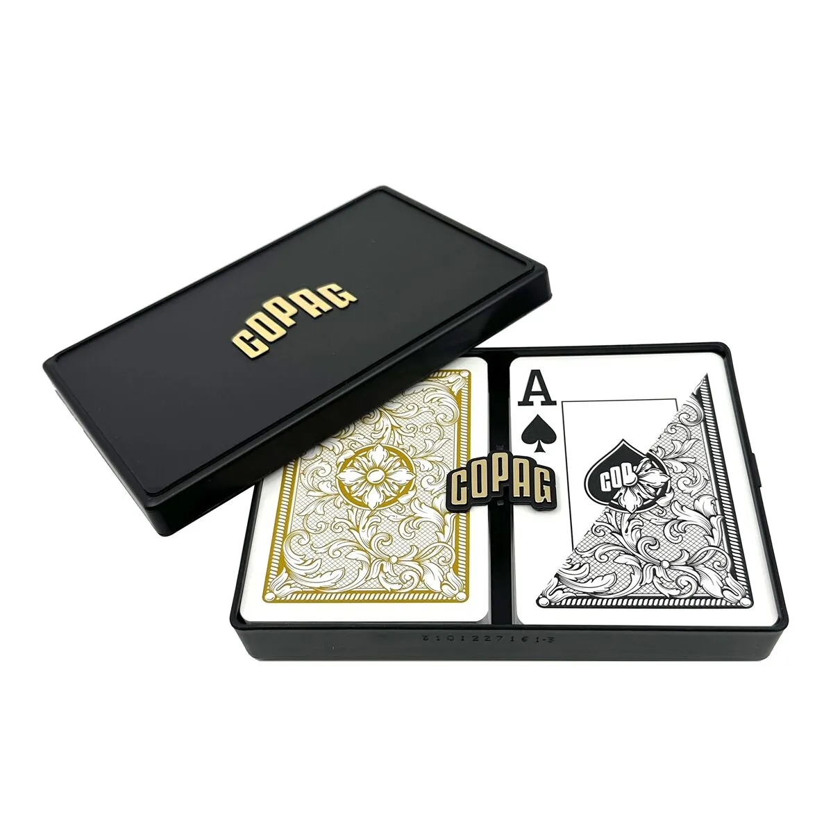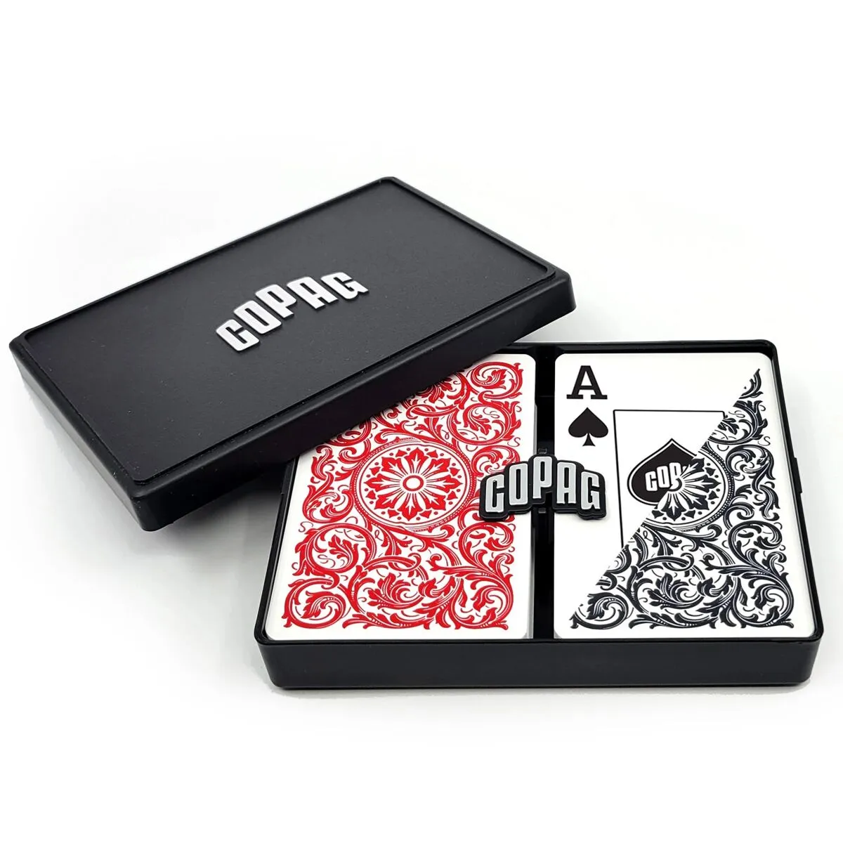 Each Copag set includes two complete decks (52 cards, 2 jokers, and 1 guarantee card) stored in a sturdy hard plastic case designed for convenient protection and easy transport. Perfect for poker nights, card clubs, and professional use, Copag cards maintain their shape, resist wear, and offer a smooth, consistent shuffle every time.