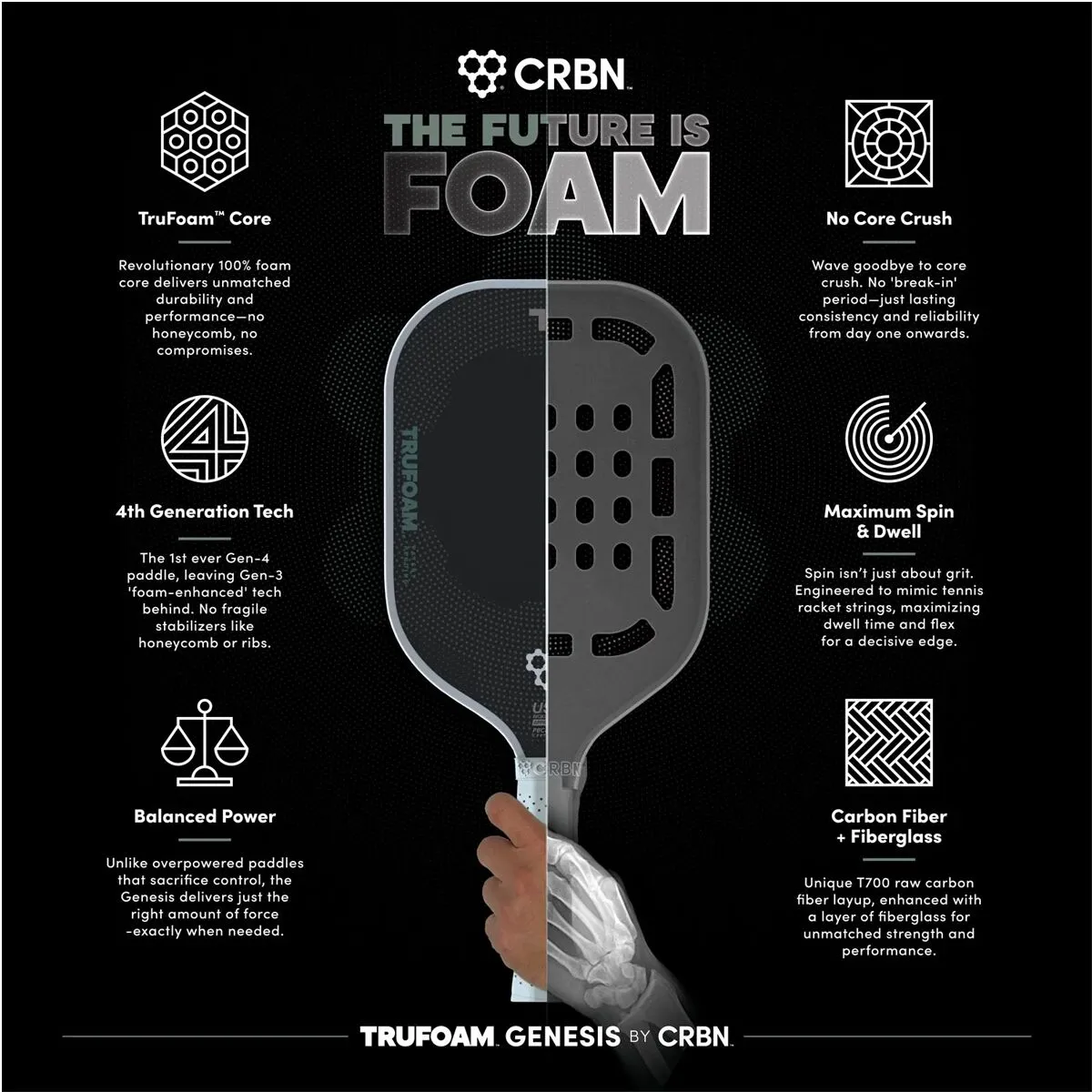 Discover unmatched performance with the CRBN TruFoam Genesis Pickleball Paddle—an advanced Gen-4 paddle featuring cutting-edge TruFoam core technology and a T700 Raw Carbon Fiber surface for ultimate control, spin, and power.