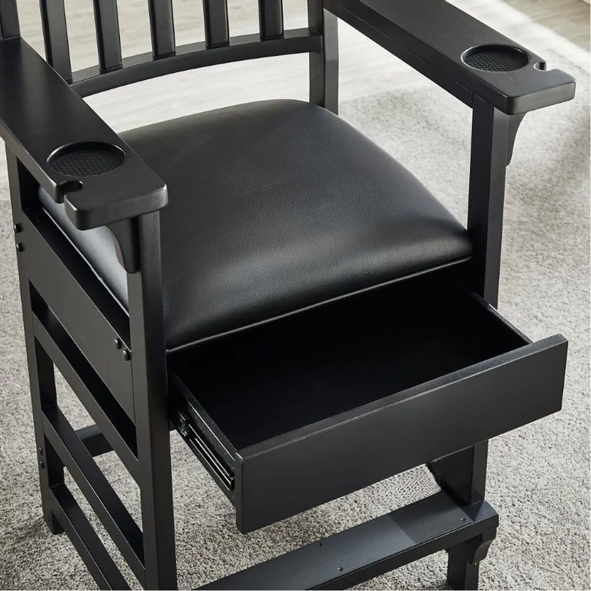 The arms have a place to rest your beverage and a notch to safely rest your pool cue.