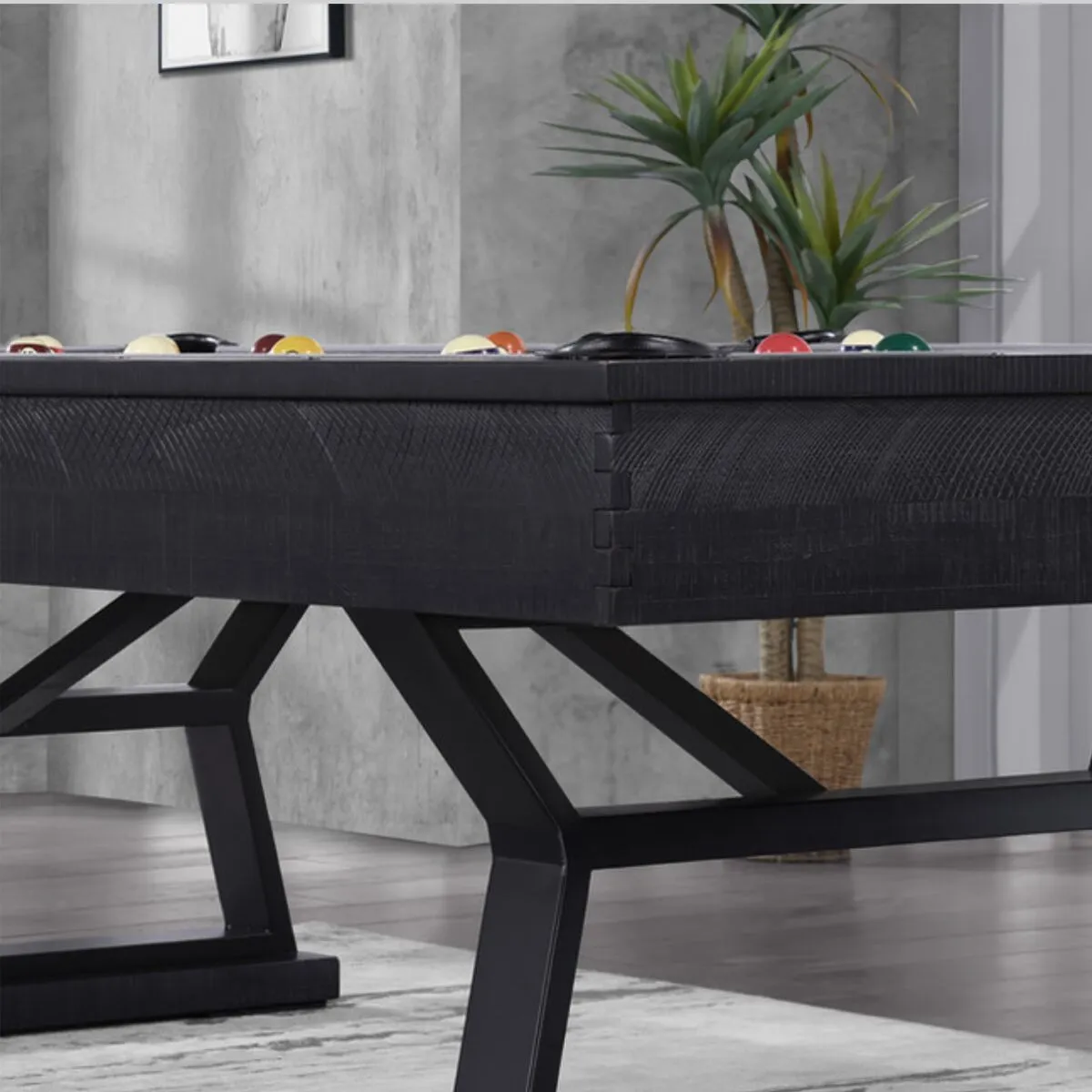 Elevate your game room with the Durham Modern Industrial Pool Table, where bold industrial design meets premium craftsmanship. Hand-finished in a rich Ink Black, this table features a sleek blend of solid wood and powder-coated steel, delivering both timeless style and uncompromising performance. The Durham is built to be the centerpiece of any contemporary space—designed for players who appreciate form as much as function.