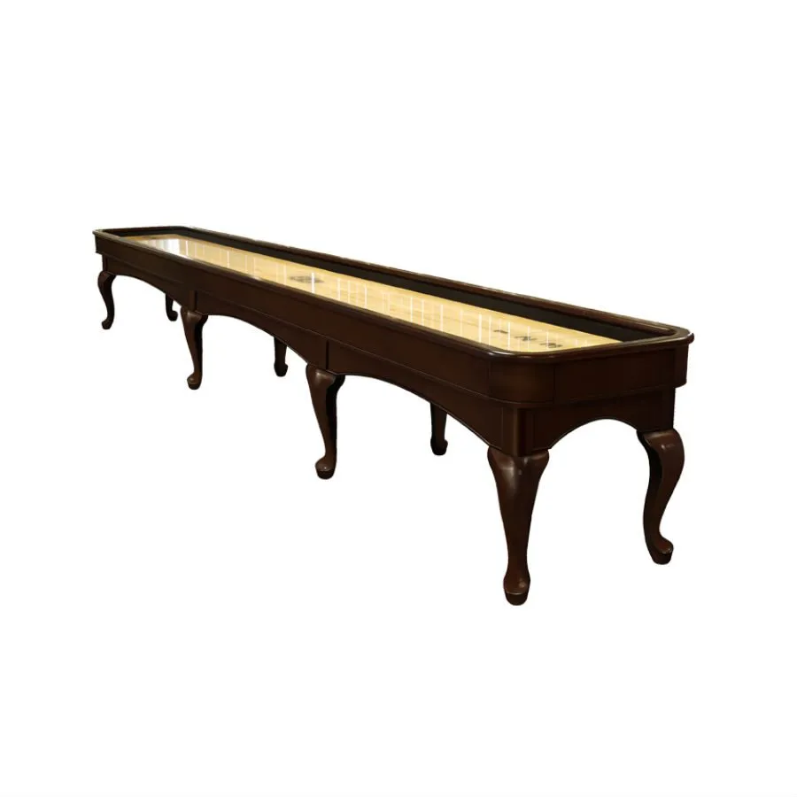 The Eclipse shuffleboard table by Olhausen Billiards is made from solid wood and features traditional style arched cabinet design with carved Queen Anne style legs. All Olhausen Billiard shuffleboard tables are handcrafted in Tennessee, U.S.A. and feature an exclusive Accu-Lock leveling system and a lifetime warranty.