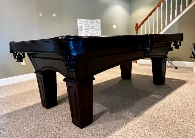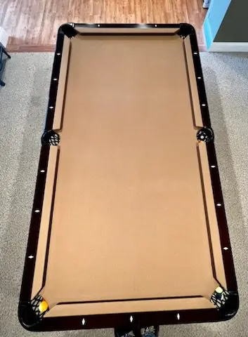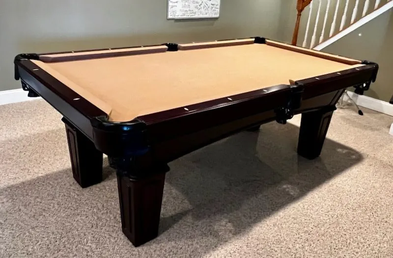 This table has Accu-fast cushions and a cherry finish.