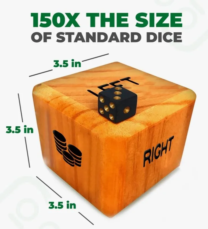 - Life-size dice — 150x the size of the original game