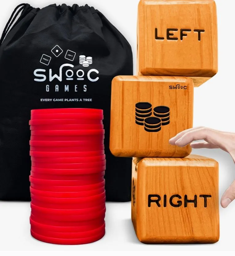 The Giant Left Right Center Game (LCR) lets you play the classic LCR dice game with oversized dice that are 150x the normal size! Roll the giant 3.5″ x 3.5″ x 3.5″ dice and pass the huge 3.5″ diameter red plastic chips as you compete to be the last player with chips. Winner takes all!