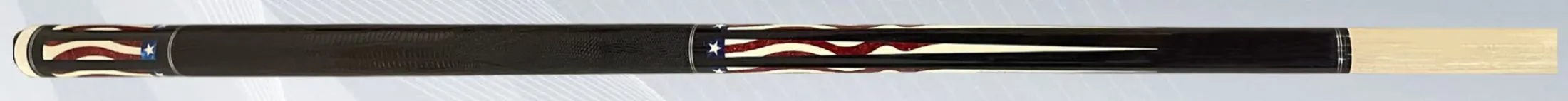 A figured maple shaft with simulated ivory stars, red sparkle and blue pearl inlay stripes, and a black lizard print wrap section.