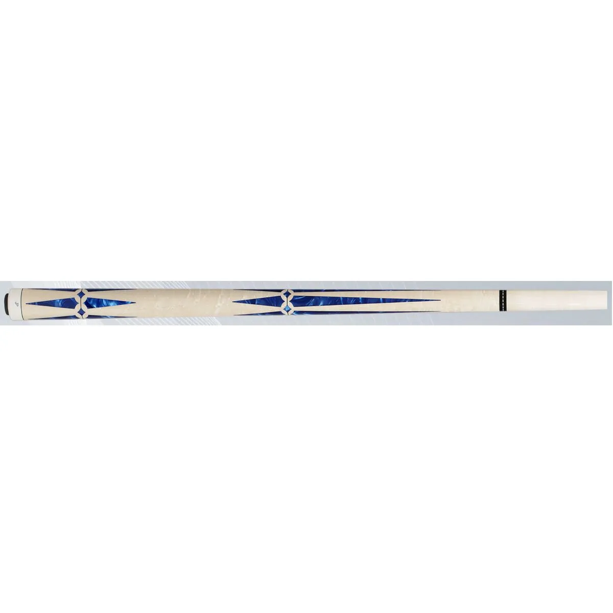 This pool cue stick features no stain birds-eye maple and blue pearl points with simulated ivory diamonds, matching points in the butt sleeve.