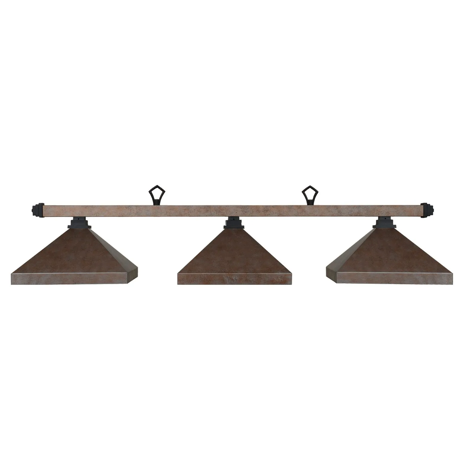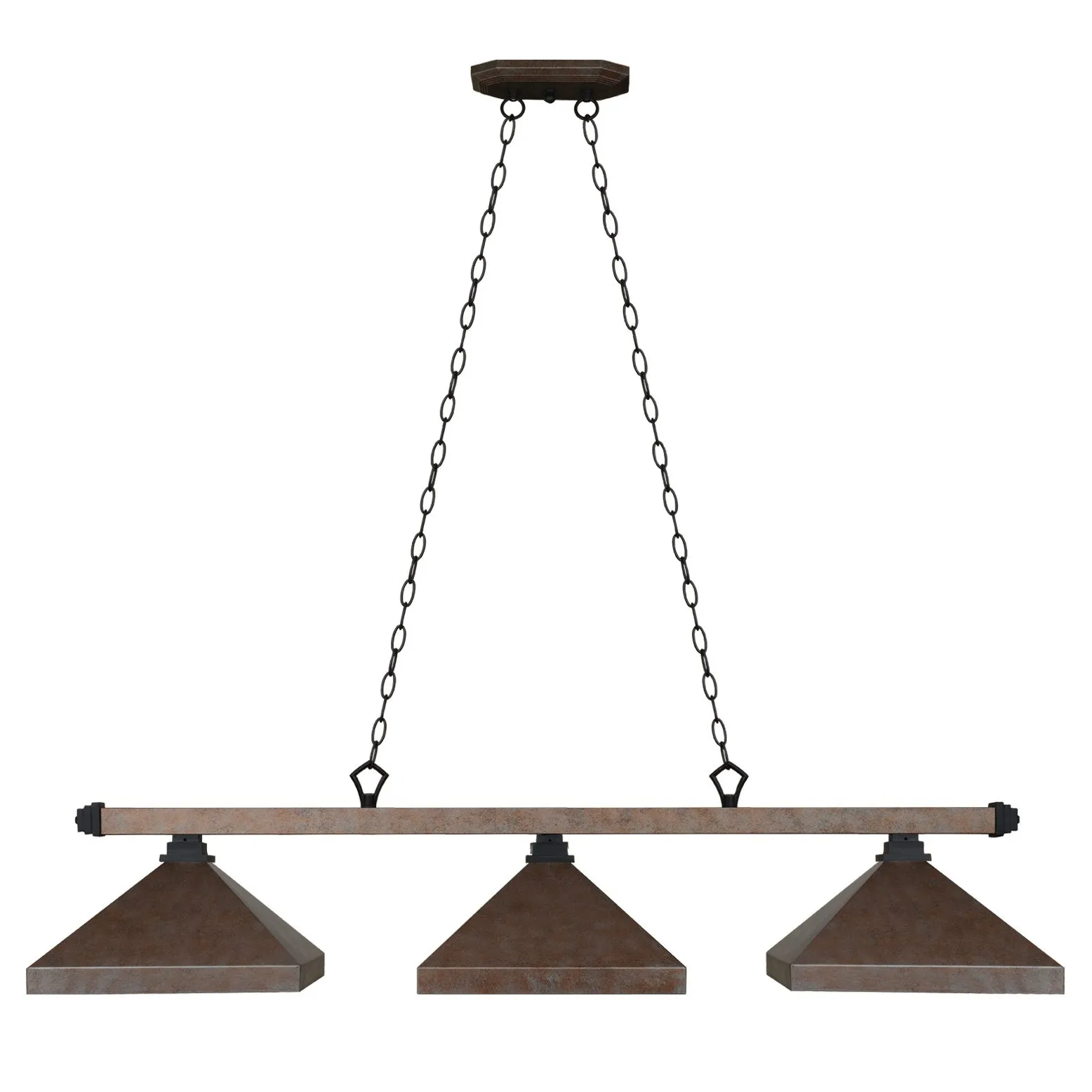 Square metal shades and decorative stepped finials are complete with an sand & matte black finish of this three-light billiard pendant.