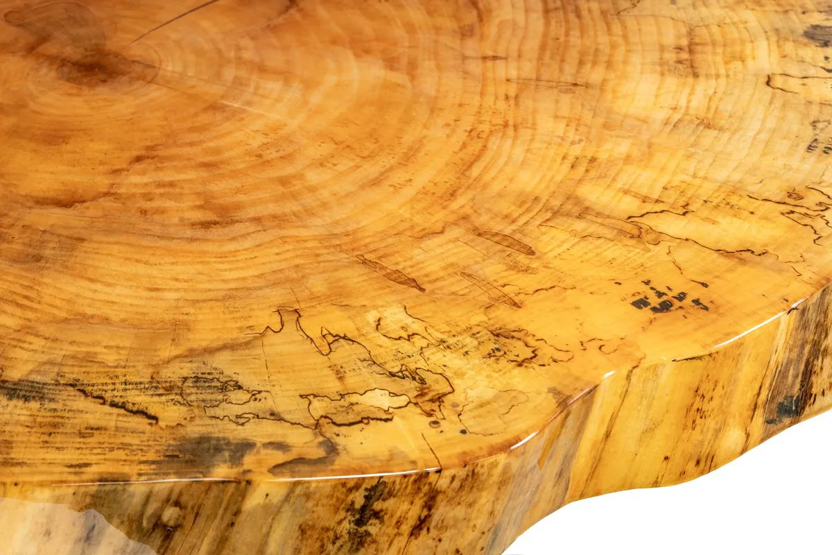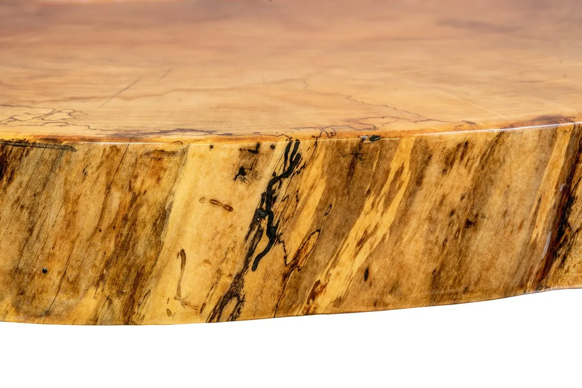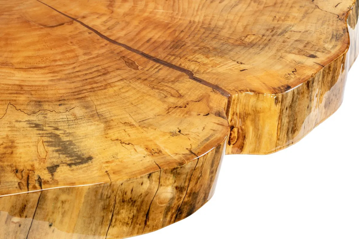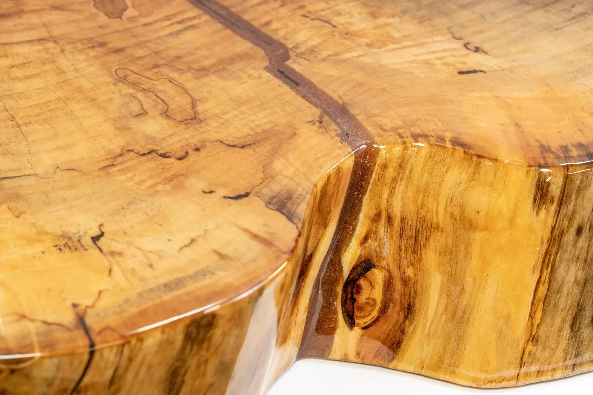 This Live Edge Maple Table Top features an acrylic resin finished natural wood with a glossy sheen. No color or stain has been applied to the wood or the finish, allowing the true grain and beauty of the wood to be revealed. To fill in natural knots and veins, a resin epoxy is used before the finish is applied. Finished on all side.