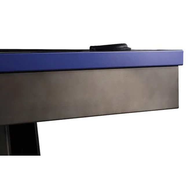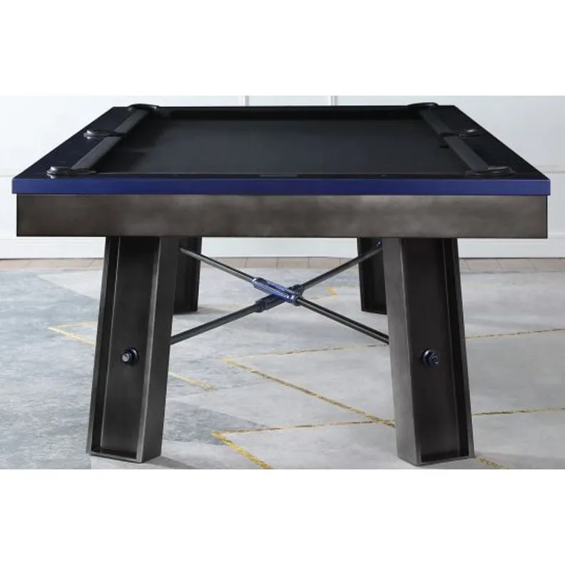 The Maddox pool table by Plank & Hide Co. is a modern industrial-style pool table made from 7-gauge steel with dramatic dramatic electric blue accents complimenting the gunmetal grey finish. The Maddox pool table features laser embossed diamond sights, three piece 1″ diamond honed tournament slate and K-66 tournament-style cushions.