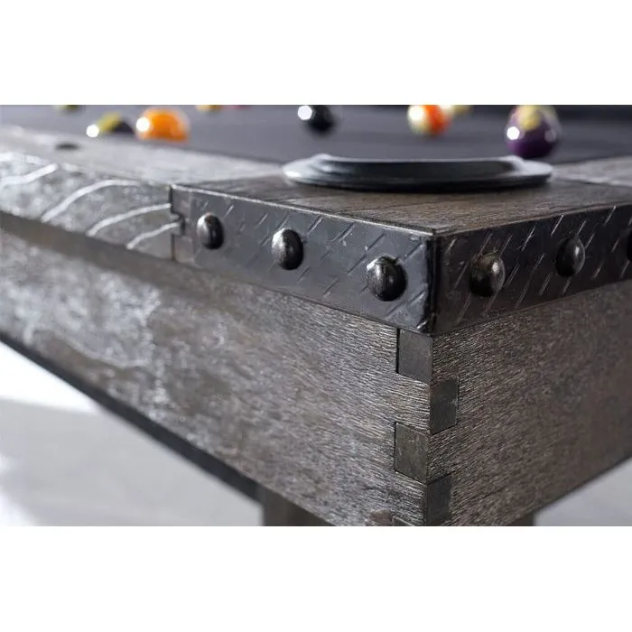 The Morse pool table by Plank & Hide Co. is a solid barnwood vintage-style pool table that embodies the master skills of old world craftsmen, with finger-jointed interlocking apron wrapped in steel braces adorned with forged industrial rivets. The Morse pool table features three piece 1″ diamond honed tournament slate and K-66 tournament-style cushions.