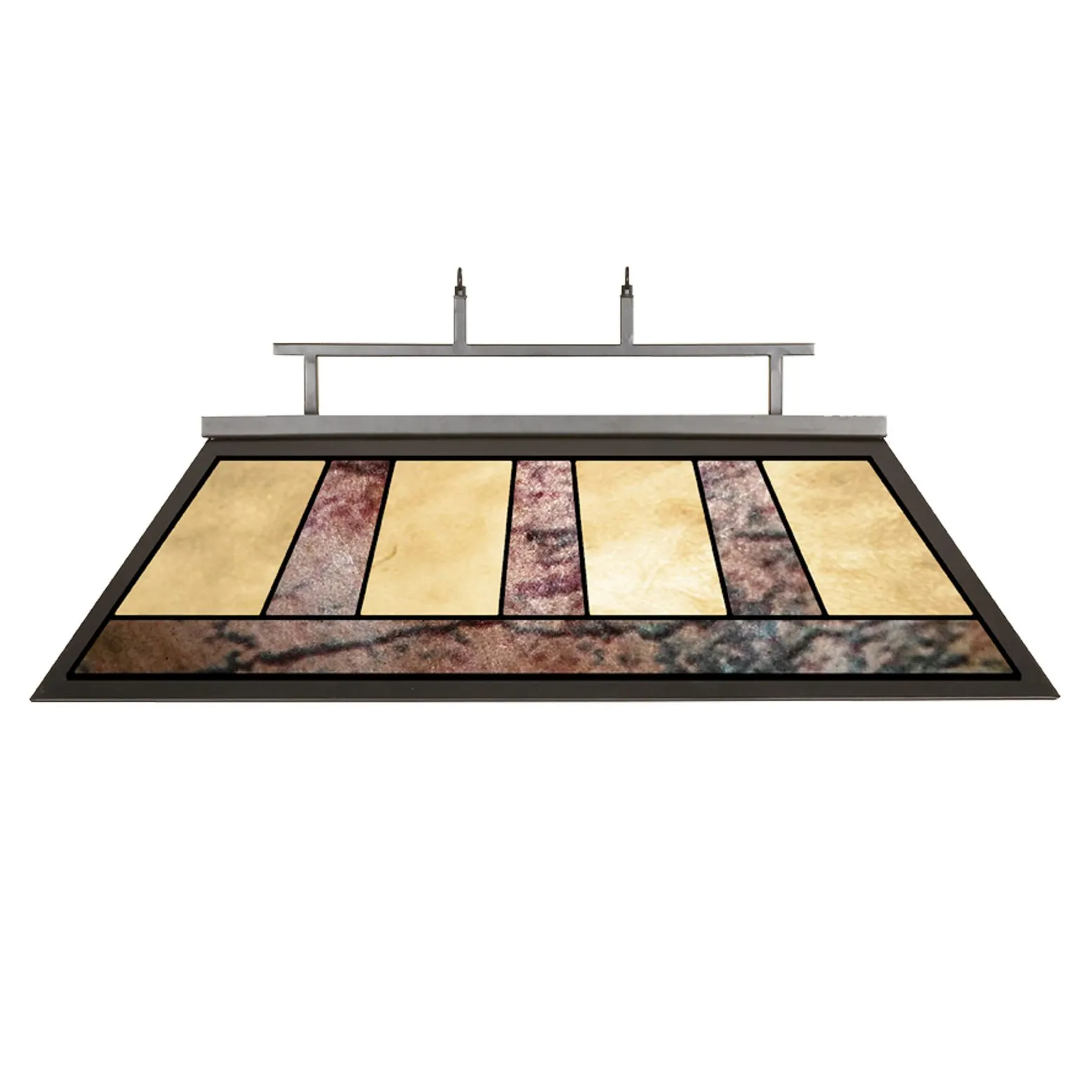 A three-light billiard pendant boasts gorgeous glass finished in amber and marble with a charming metal framework design bring character and beautiful illumination to a pool table.