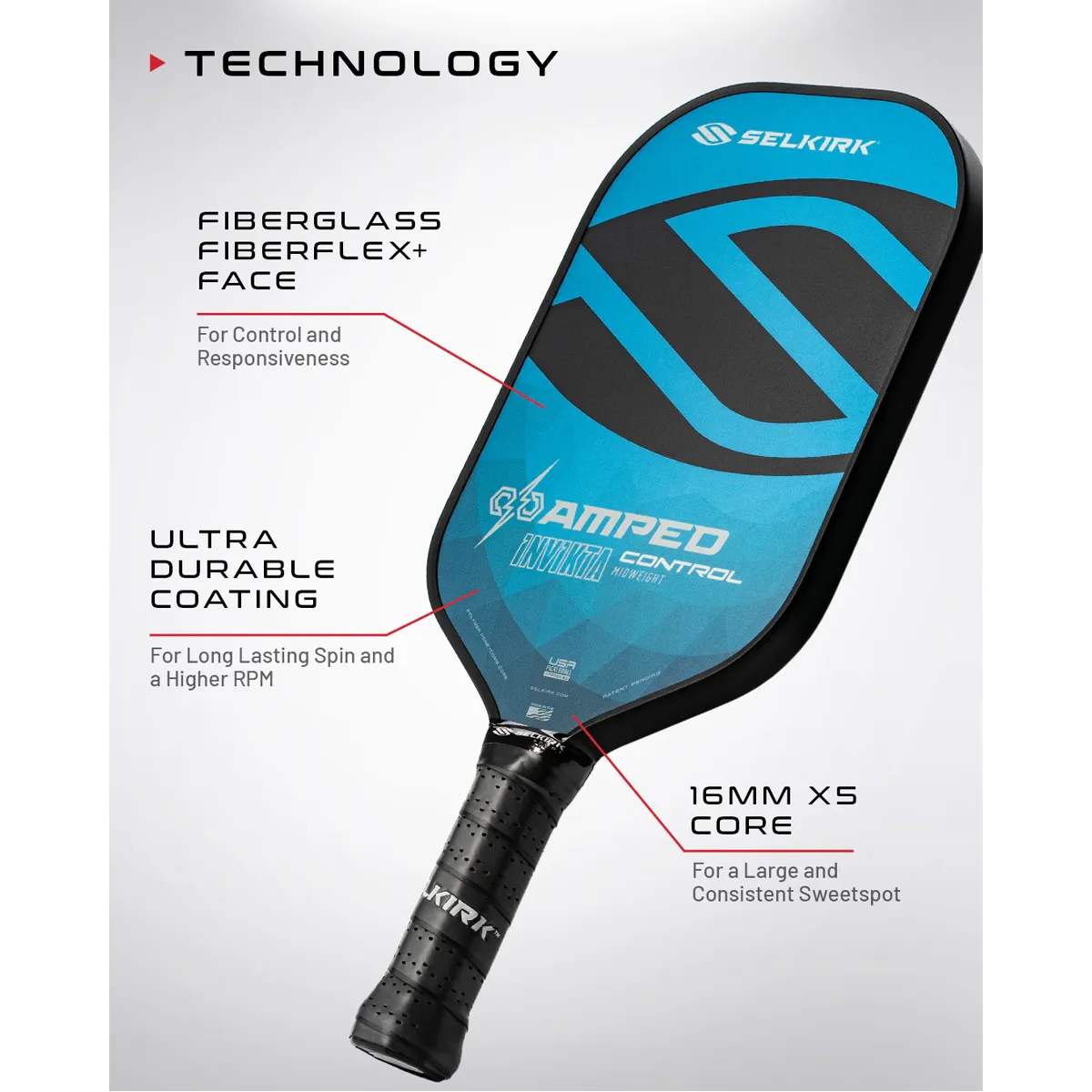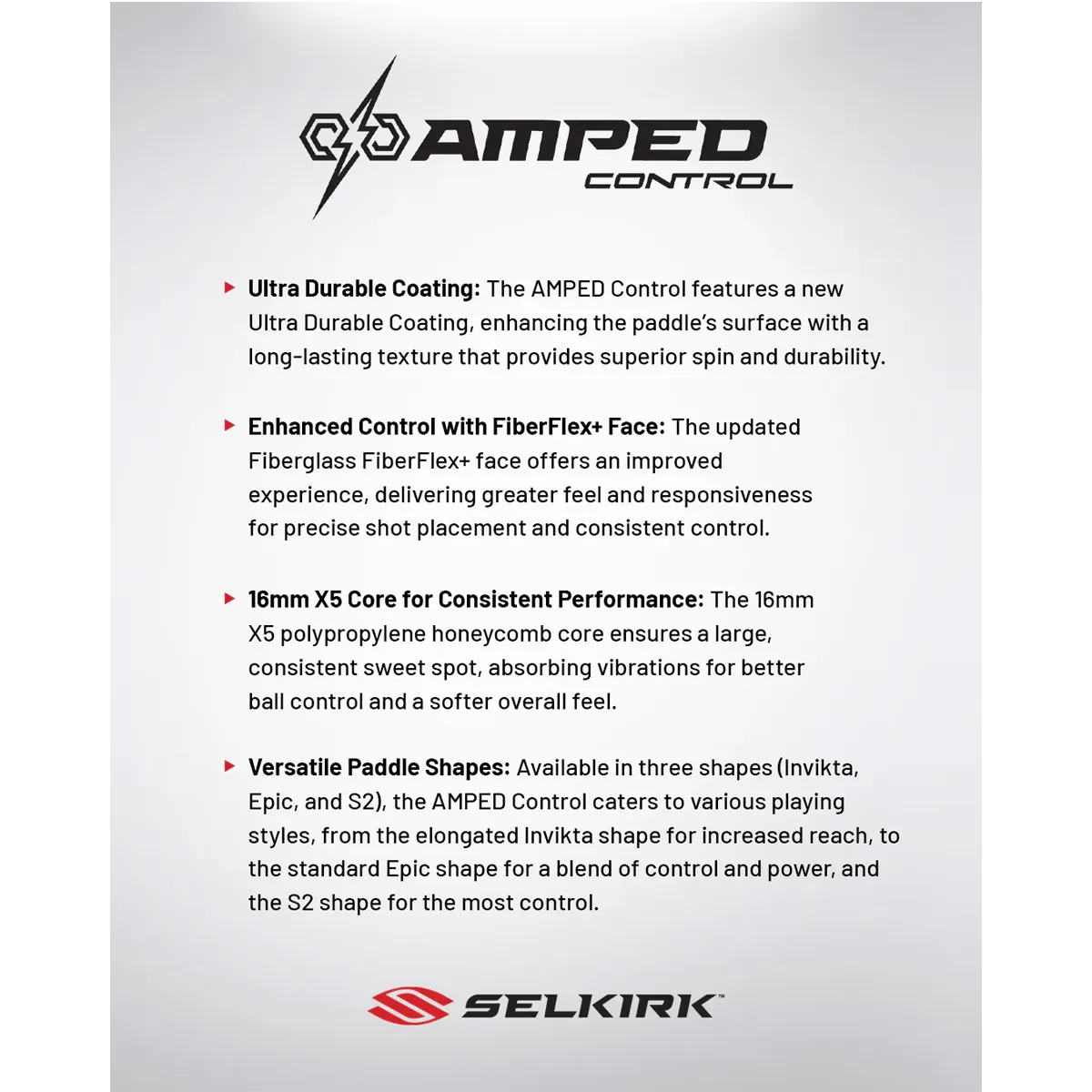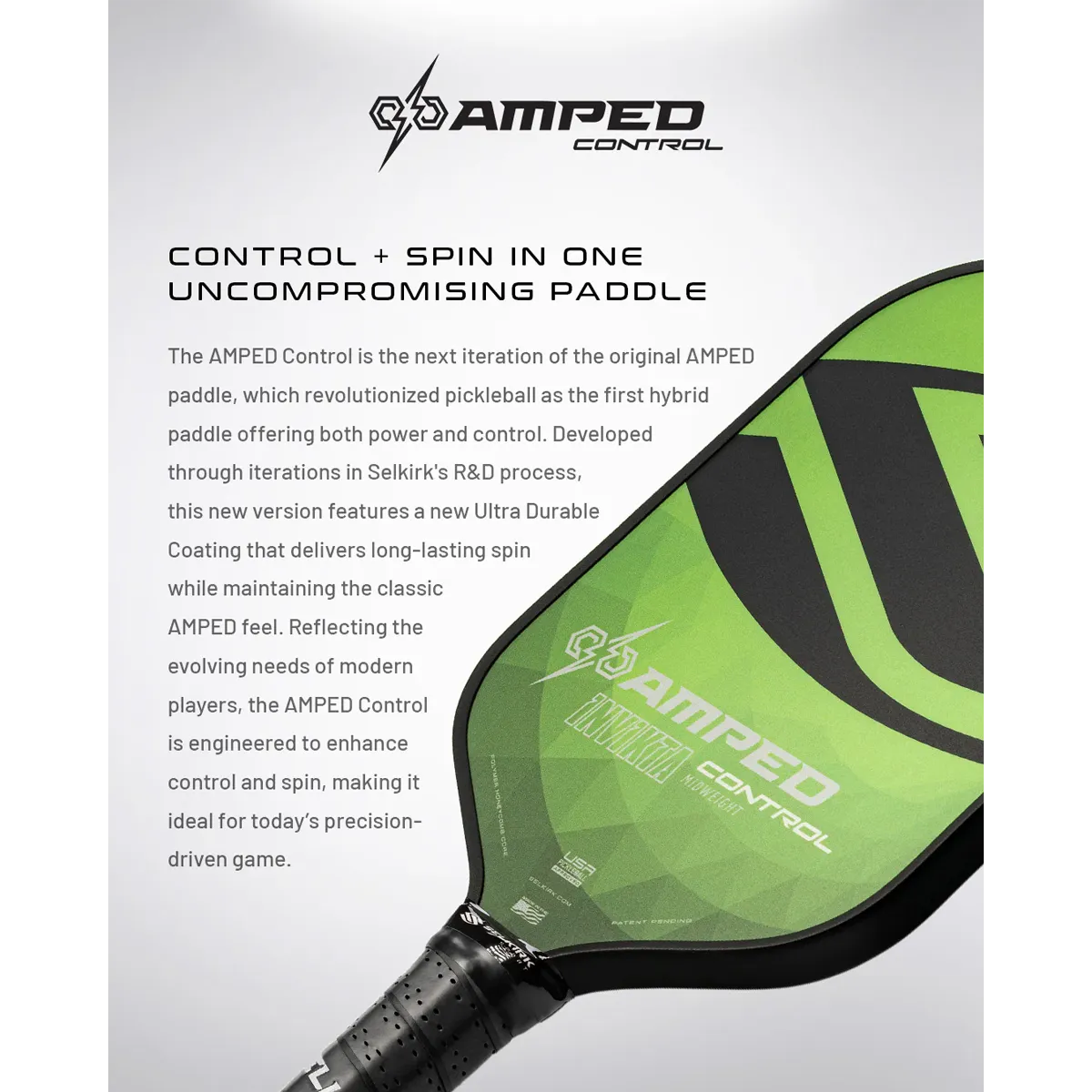 Now, Selkirk is excited to introduce the AMPED Control, a paddle designed to evolve your game. This new iteration features a next-generation Ultra Durable surface coating, that provides long lasting spin, while maintaining the classic AMPED feel that players know and love. The new Ultra Durable coating is the result of hundreds of evolutions and iterations in our R&D process creating a paddle that now delivers longer lasting spin.