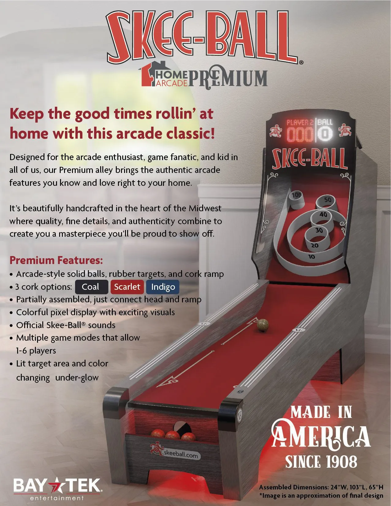 At about 20% smaller than the Classic full size game, Skee-ball Home Premium by Bay Tek is the perfect size for your family game room. The updated design will be a great complement to any decor. So, grab the family and get gaming!