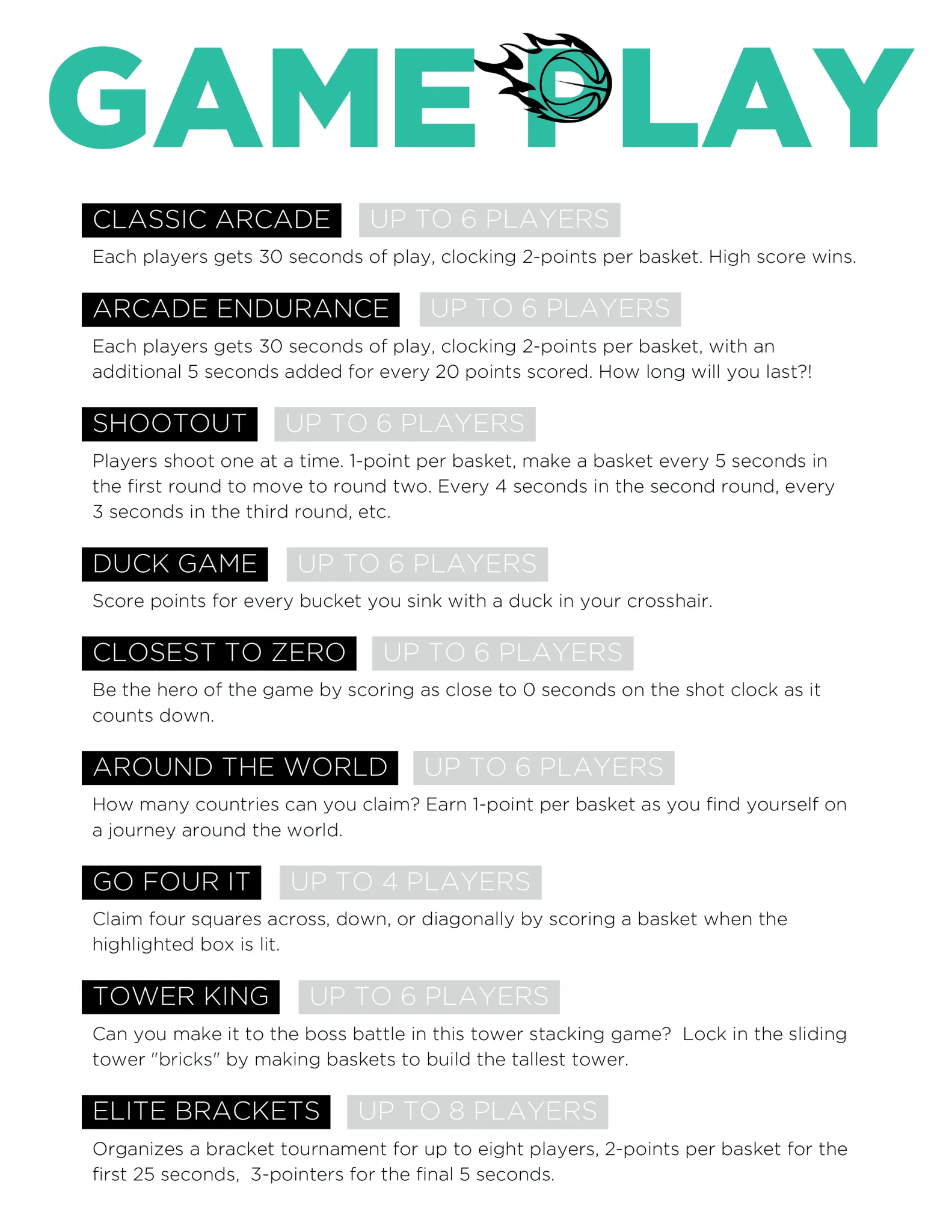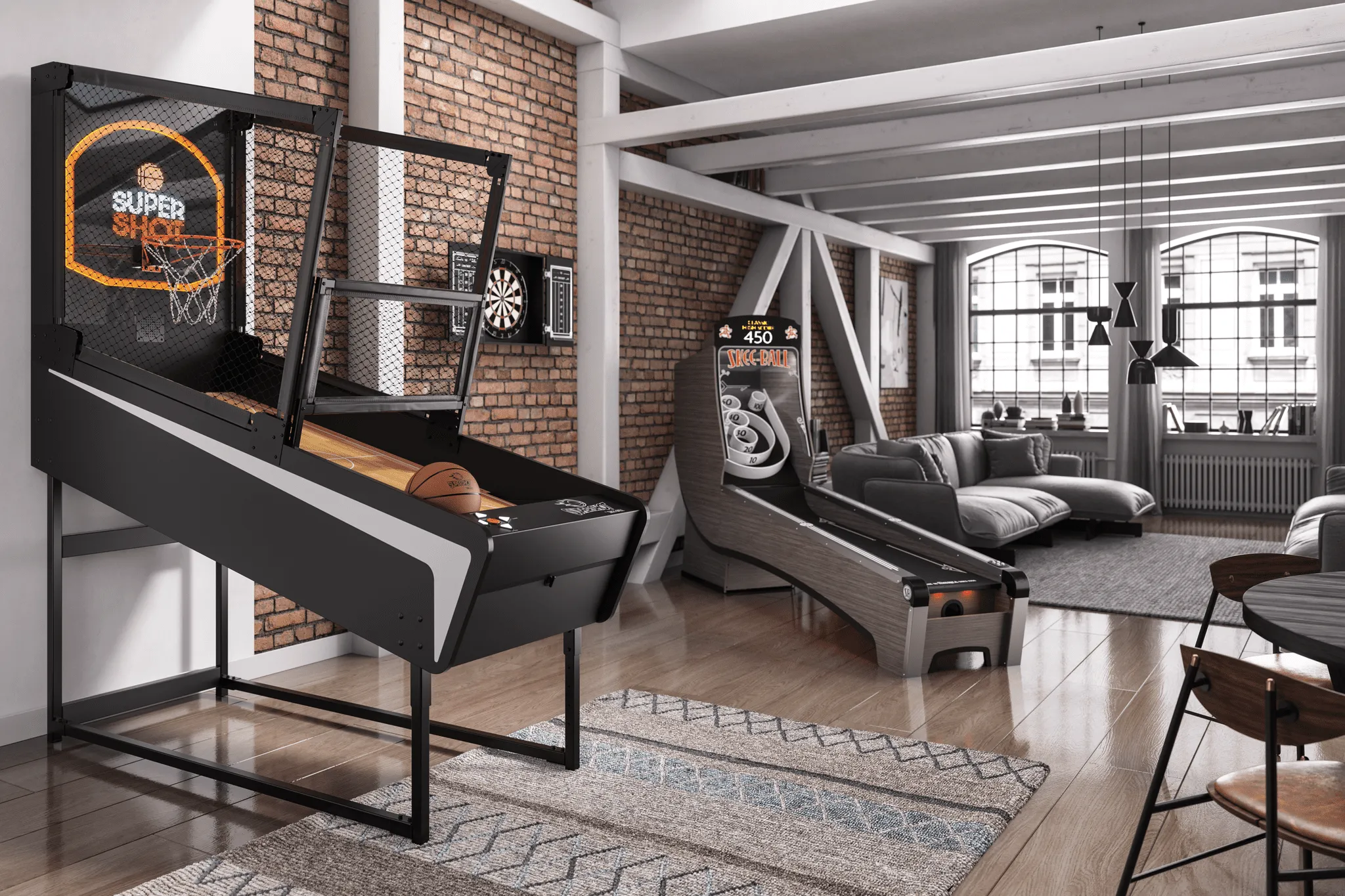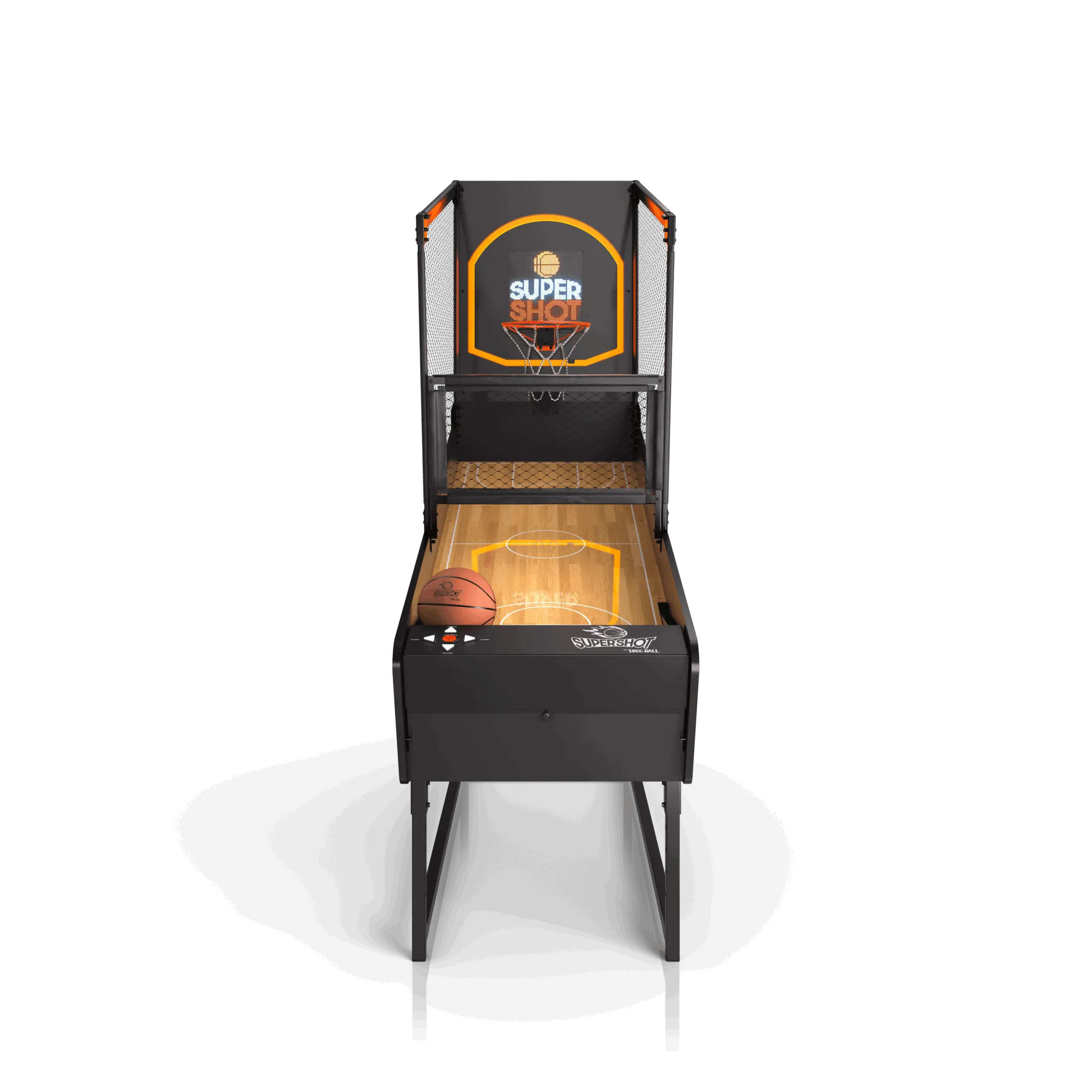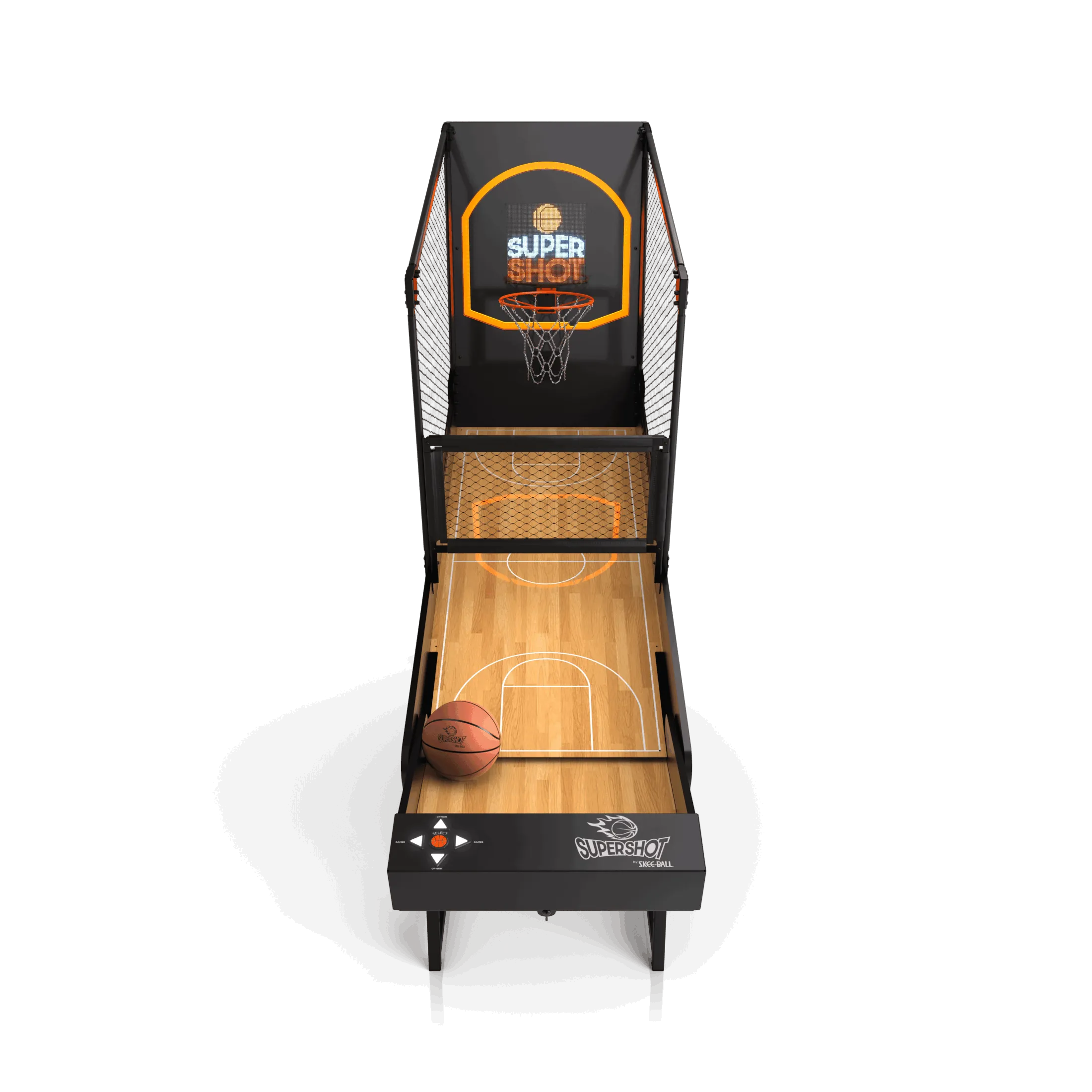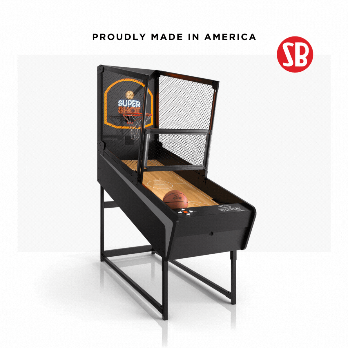 Lace up your sneakers and perfect that jump shot, because something big is coming! Adjusting from 7’9″ to 8’6″ in height will accommodate most ceiling heights. The SuperShot by Skee-Ball in-home basketball game features custom LED lit backboard nestled atop a sleek chain-link hoop for a larger-than-life experience. Eight unique game modes are offered for up to eight players. Handcrafted in the heart of the Midwest – proudly made in the USA.