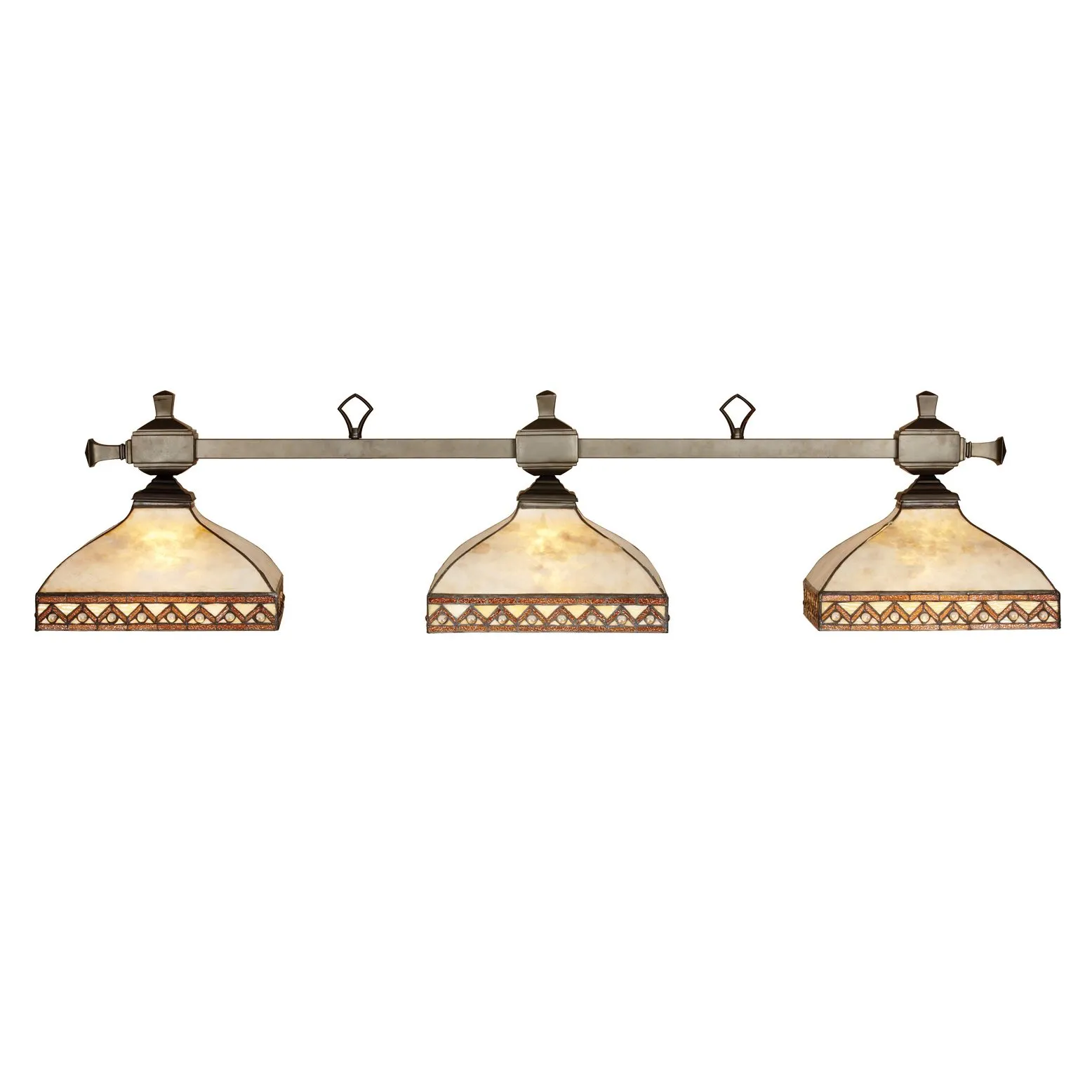 Soft beige mica finishing lends softness to the three glass shades with stained glass bordering featured on this metal billiards pendant light.