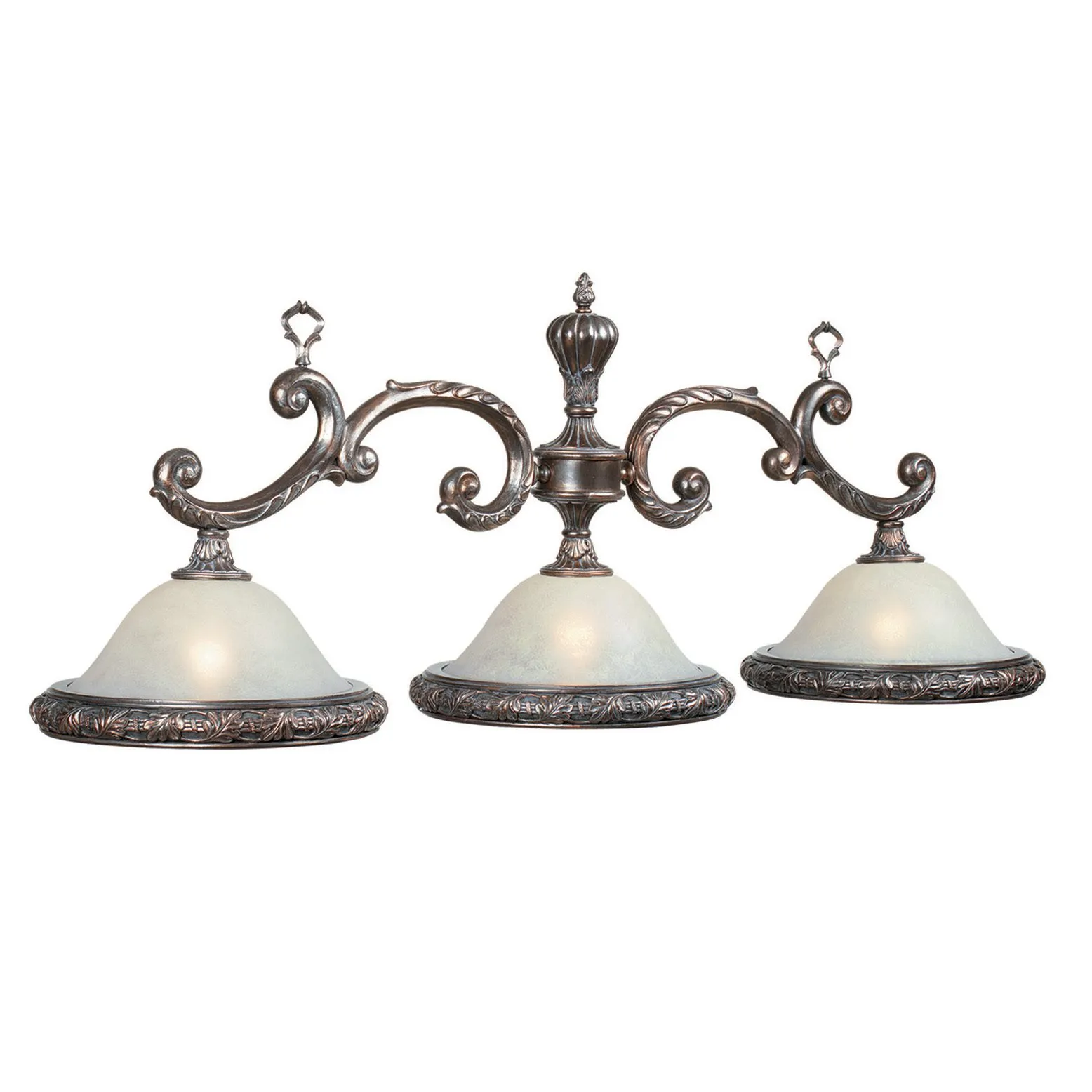 Scroll accents bring classical style to the weathered bronze metal bar featured on this three-light billiards pendant with traditional metal-rimmed glass shades.