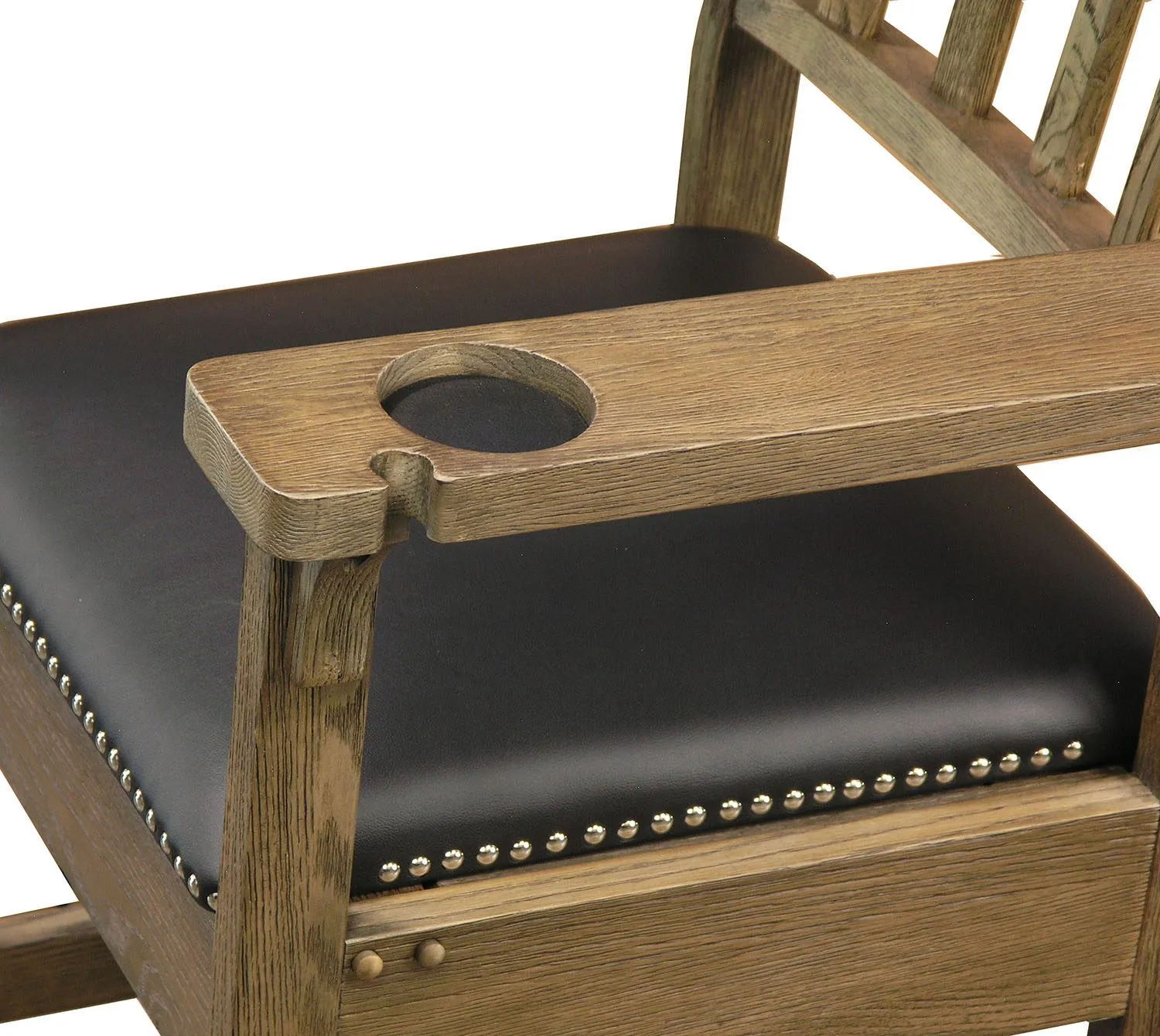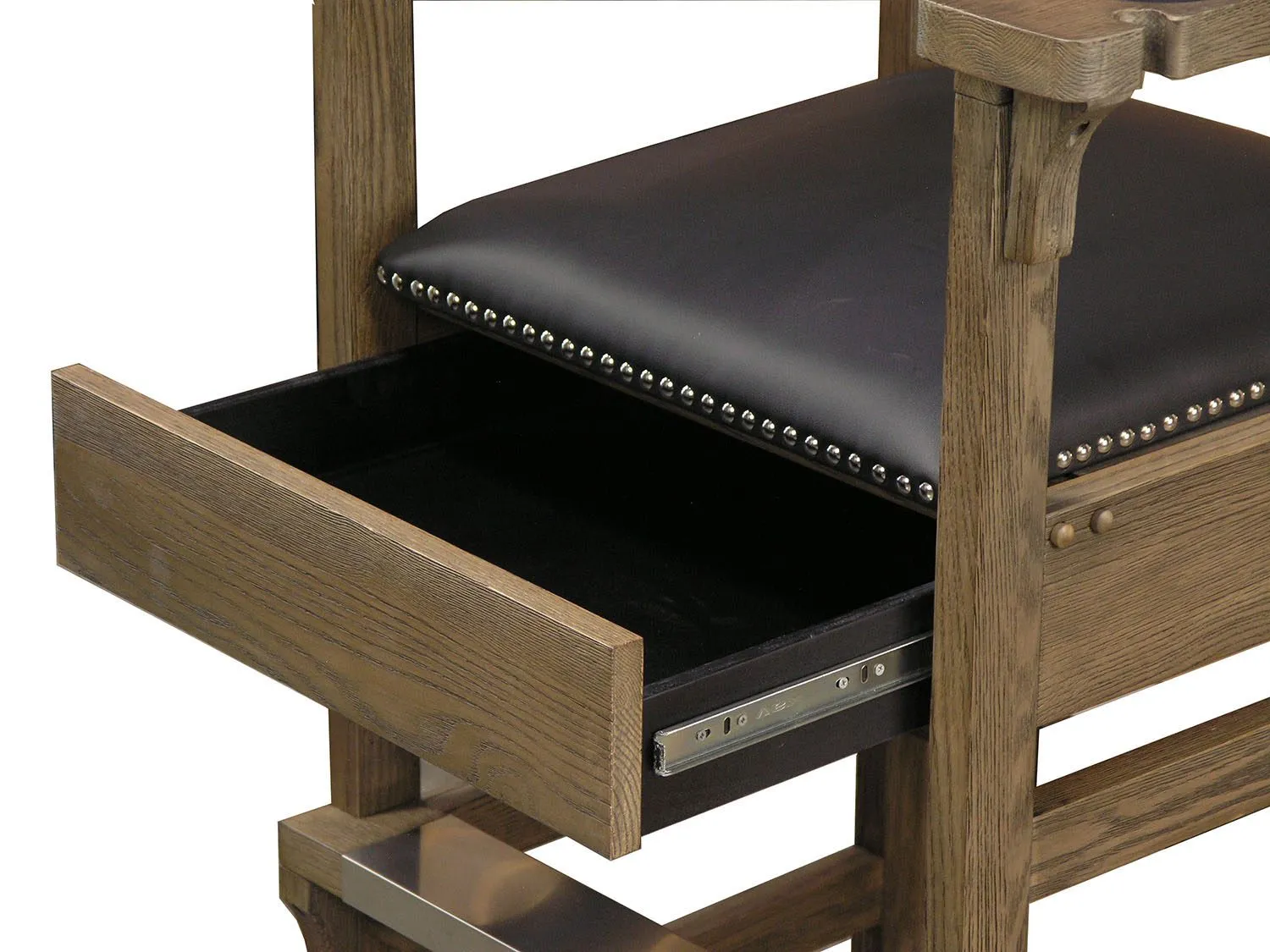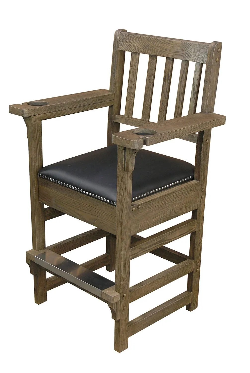 This farmhouse style spectator chair offers a rustic look. The will designed stool offers wide arms, cup holders, and a storage drawer for small accessories.